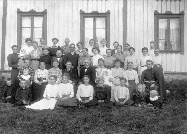 Svanvik, missionsförsamlingens syförening samlad utanför Karl Erikssons hus år 1911. Förstoring 39 x 50 cm. Neg finns. För namnlista se bilaga till 53620.