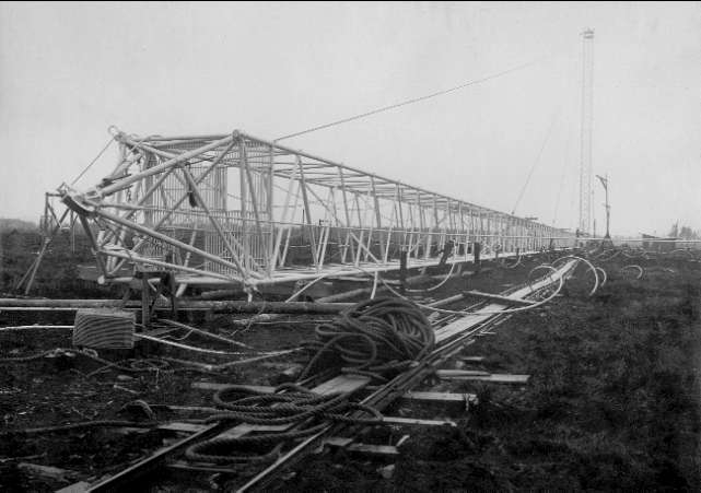 Karlsborgs radiostation i Kråk. Masten är monterad och klar för resning, år 1916. Masterna är konstruerade av professor K Ljungberg, Stockholm, var 210 m höga och vägde 25 ton. Foto: Alfred Sjöberg, Karlsborg. Masterna revs i mars år 2001.