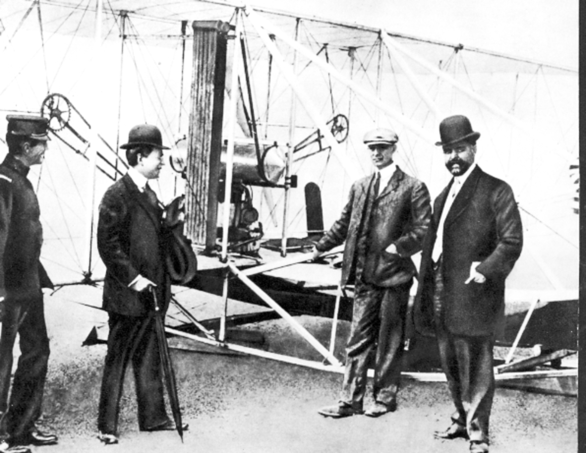 17 dec. 1903 - den dag då motorflyget föddes. Flygplanet visas här av Wilbur Wright (andra från höger).