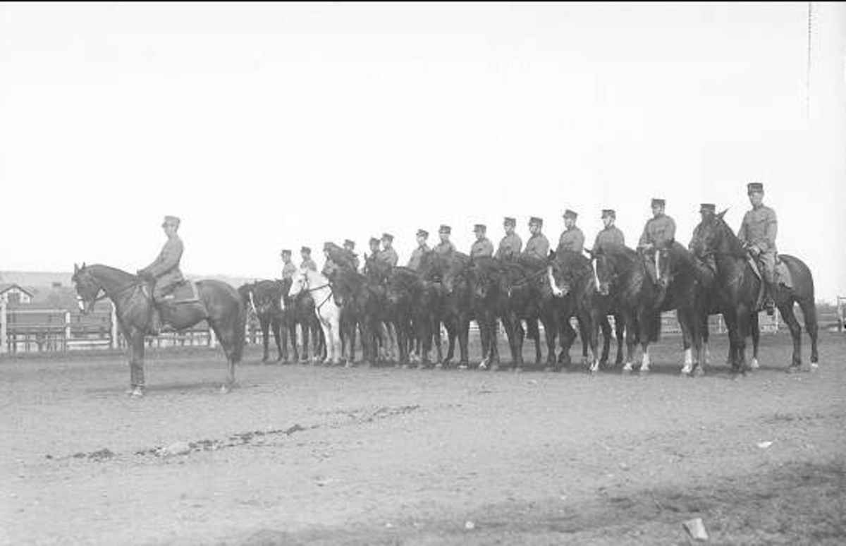 Uppställda för avlämning på dressyrbanan öster kasern före utbildning i ridning. Antagligen en stamskola ur 3. skv serg. Magnusson väl beriden på Dafne E Wer Weiss - Reform **.