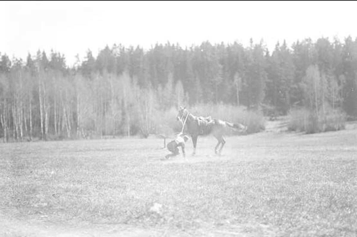 Skövde fältrittklubbs vårtävlingar. Troligen fälttävlans terrängritt i terrängen söder Sandfältet (södra fältet). "En stilla avsittning" mellan två hinder. Vad kan ha hänt?