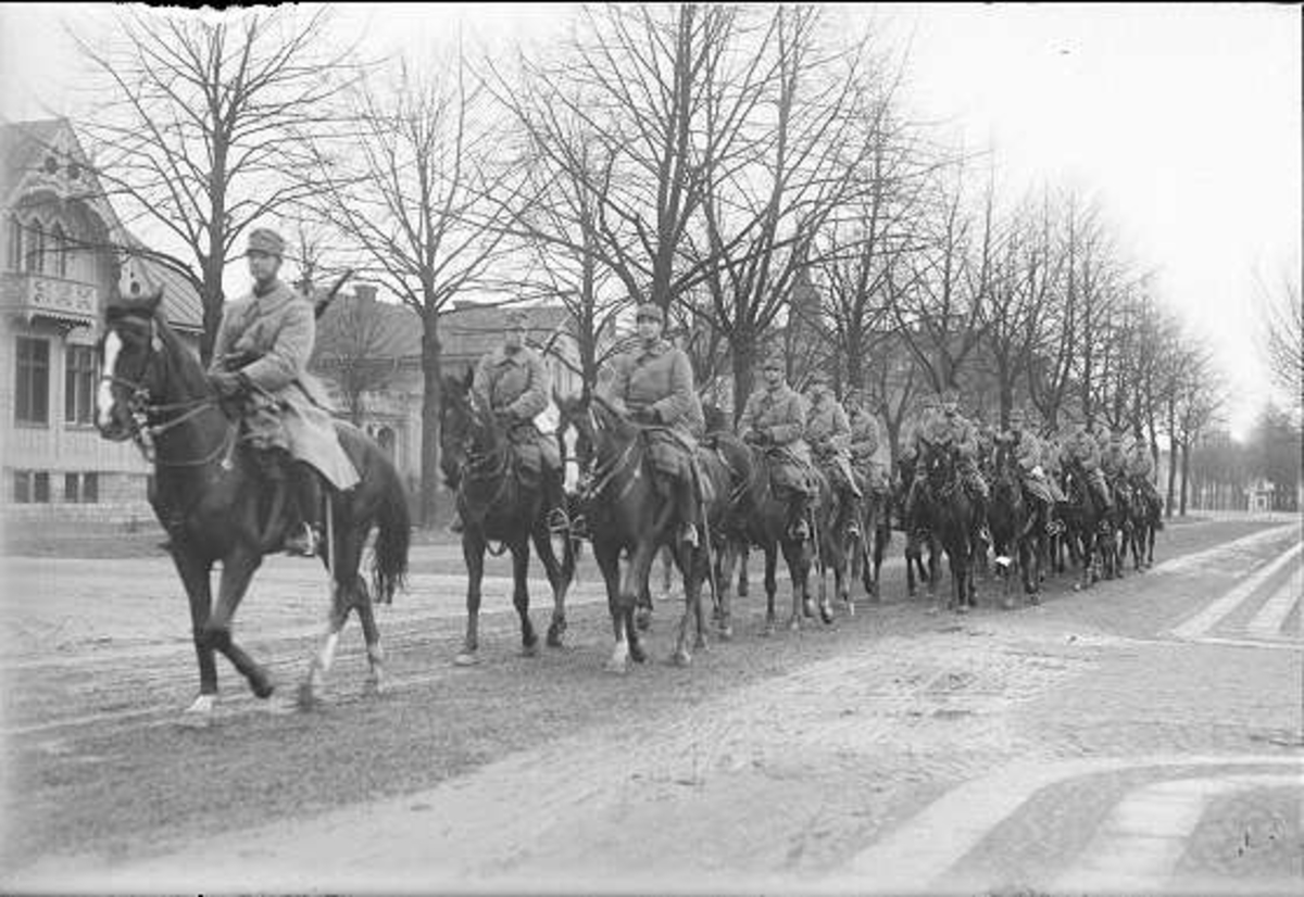 Aspirantskolan på hemmarsch från övning. Här utanför Drottninggatan 12.