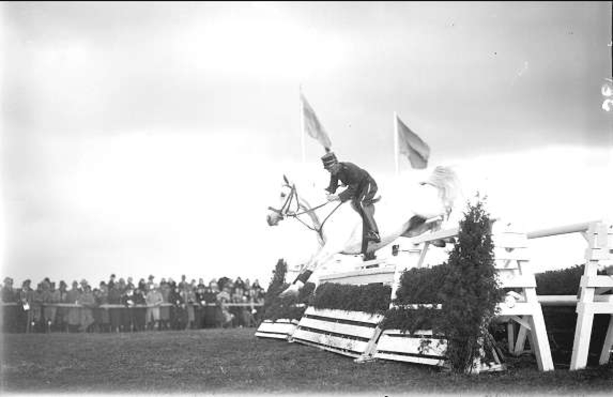 Titel: Skövde fältrittklubbs tävlingar 1930 på prishoppningsbanan öster kasernen. Observera åskådarmassorna - vissa år närmare 10.000 personer sammanlagt på lördagar och söndagar.