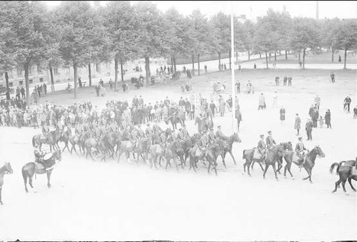 Parad på Gustaf V:s födelsedag 1928. Förbimarsch för platschefen överste Reuterswärd på skolplan framför Eric Ugglas skola. I bakgrunden till vänster milostabsbyggnaden.