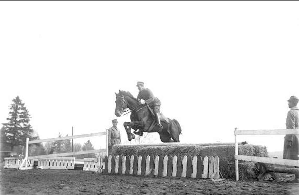Titel: Utbildning i hoppning på södra fältet troligen en kavalleriofficersaspirantskola.