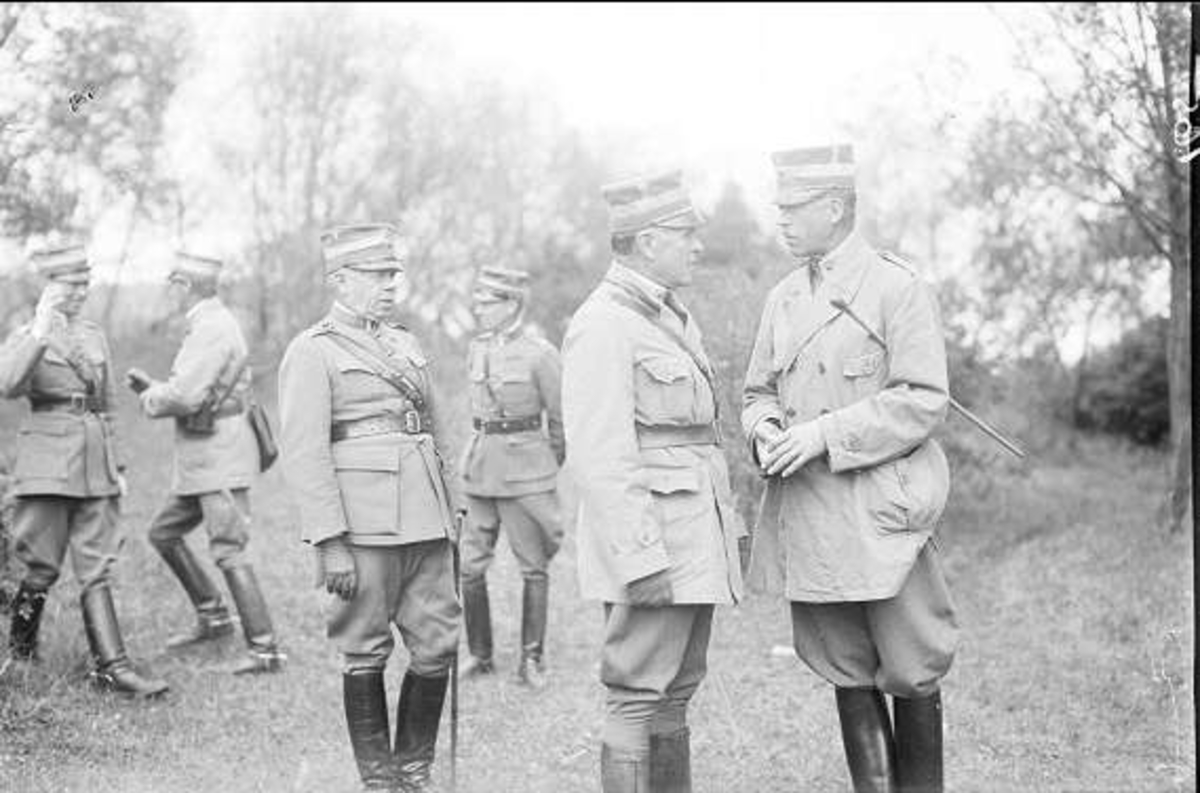 Officerare från kavalleriinspektionen och olika kav.reg. samlade i Skövde vid kavalleriförsöken. Från vänster: övlt H. Peyron, öv S. Ryman, öv Ce Knös, öv Å. Hök, gen L. Lilliehök, gen G. Gyllenstierna.