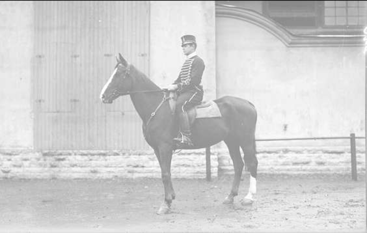 Livhusar på tilldelad stamhäst utanför skvadronsstallets östra långsida.