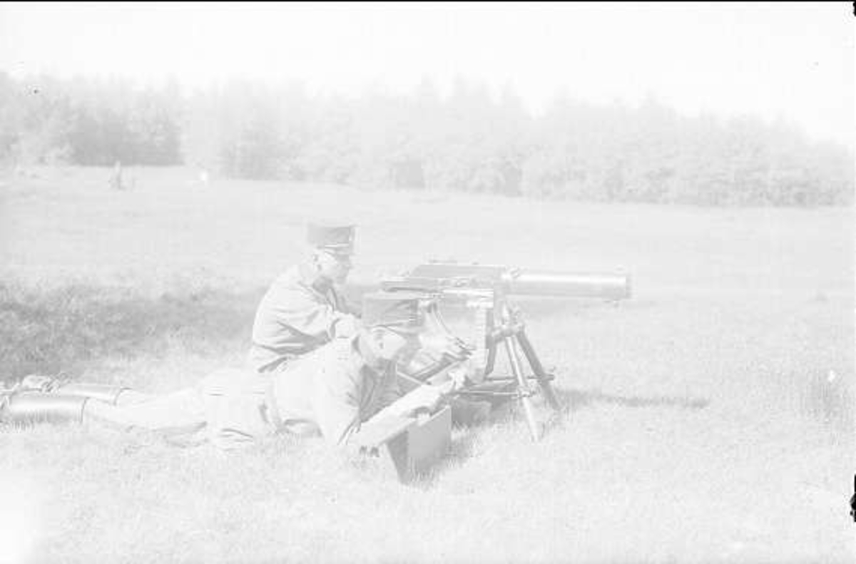 Kulspruteutbildning med 4. skv. Kulspruta m/14 uniform m/10 med mössa m/1895. 4. Skvadron benämndes ofta "tunga skvadron" ty där var all utbildning på tunga vapen (kulsprutor och granatkastare) samlade.