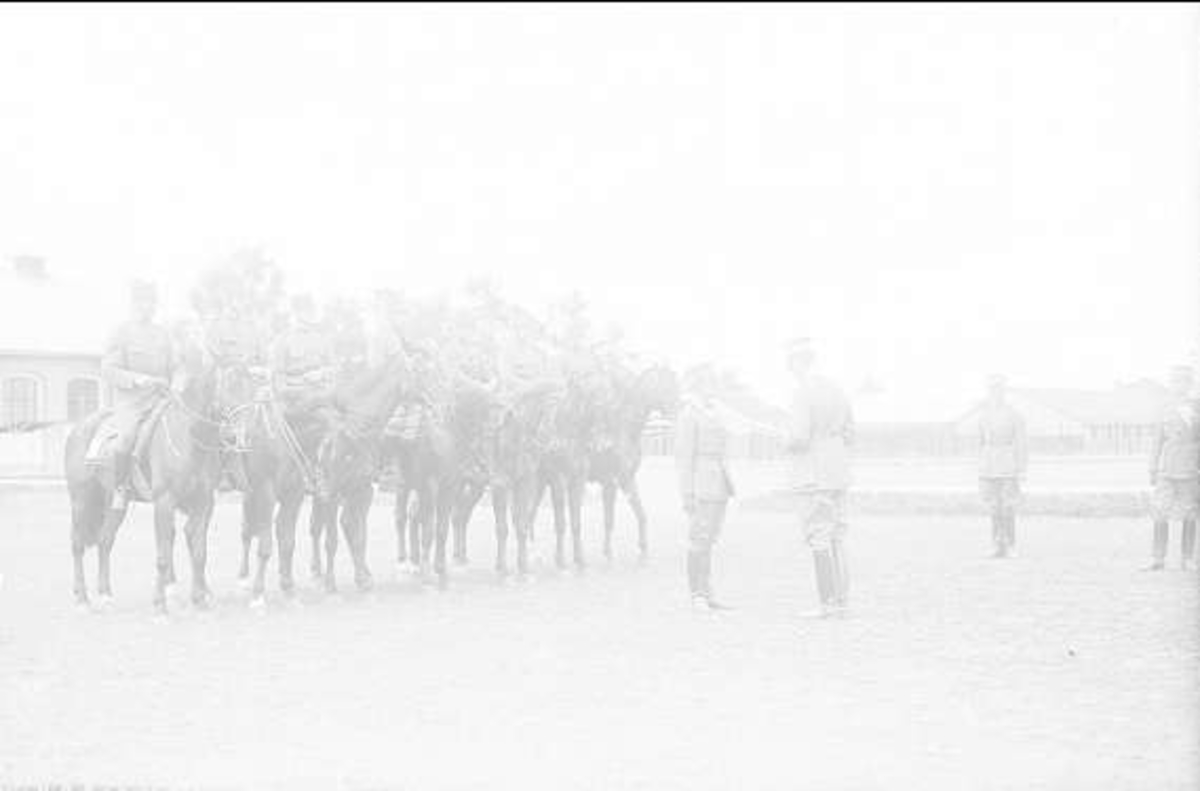 Inspektion i ridning av kavalleriinspektören general G Gyllenstierna. Framför avd löjtn Stig Roempke, längst bak ryttm Harald Strömfelt.