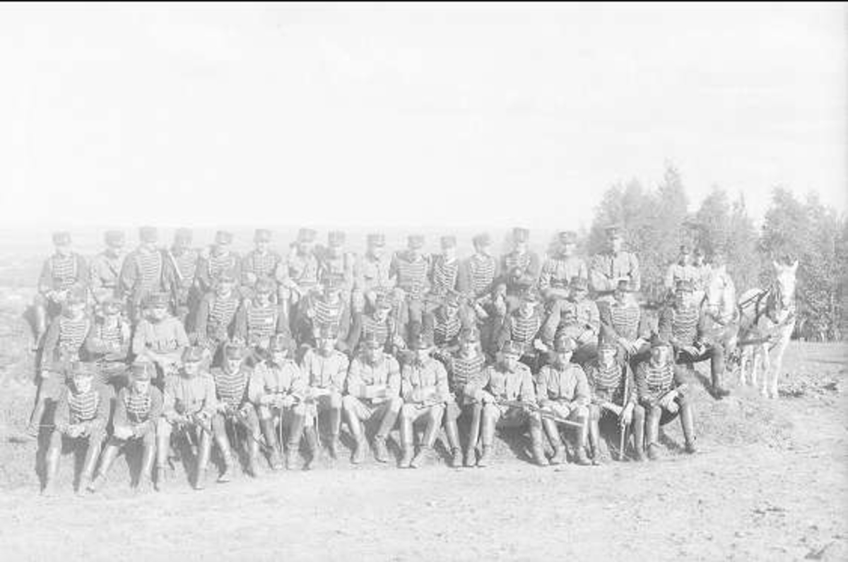 Del av 4. skv vid skjututbildning på Hene. Obs! Trossen på flygeln - ofta med vita hästar. Klädsel omväxlande m/ä och m/10, dock samtliga med mössa m/ä.