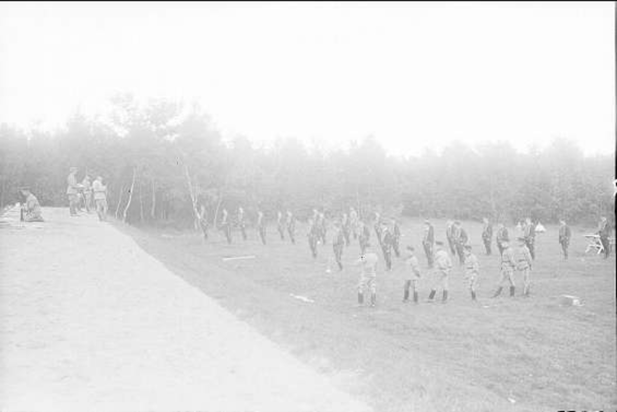 Skjututbildning med 4. skv på skjutbanan nedanför Alphyddan (Billingehus). Ett befäl i m/23, truppen i m/ä och m/10. De i m/10 hade mössa m/ä.