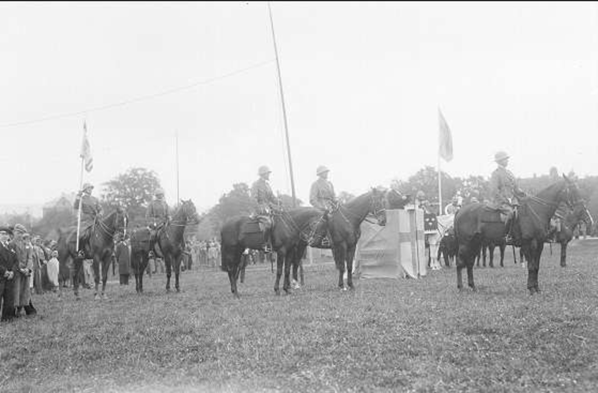 Sekundchefen överste K H Palmstierna med stab coh standar färdig för att taga emot kamratdagens deltagare. Bakom sekundchefen skymtar musikkåren med den vita pukhästen.