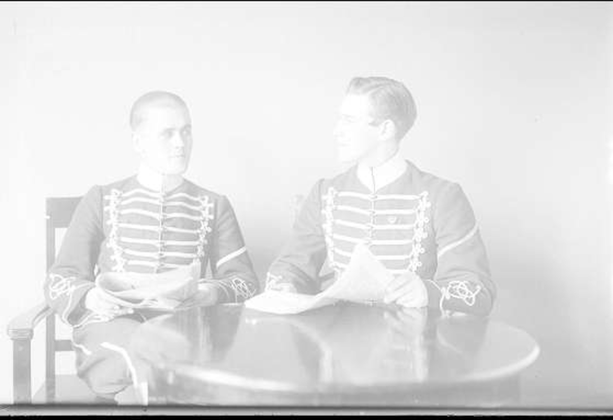 Två livhusarer i m/ä. Troligen korpraler med ett skolstreck på vänster ärm.