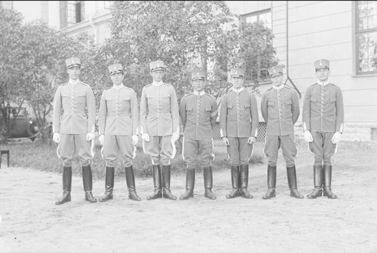 Underbefäl ur K 1 Stockholm som genomgått armens underofficersskola. (Trestreckad furir) tillsammans med sex elever i uniform m/ä. Furiren och tre elever i kronans uniform, tre elever i privat uniform. Kronans uniform något mörkare än de privata. Blir stor färgskillnad på fotot på grund av glansen i tyget på den egna uniformen. Asp. D´Otrante tredje från vänster i bild. Gruppbild.