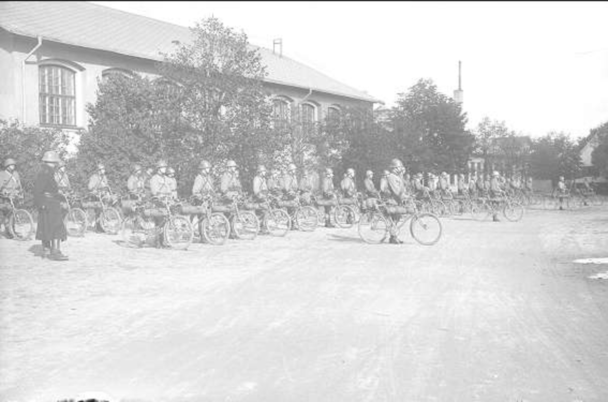 Utbildningskurs (cykelförband) för kavalleriets underbefäl. Avlämning före övning på kaserngården framför gymnastiksalen.