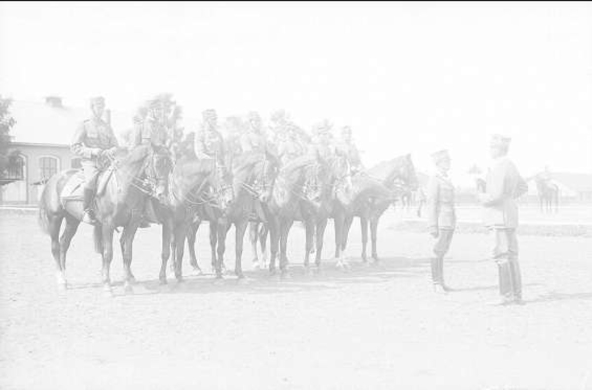 Inspektion ridning av kavalleriinspektören general G Gyllenstierna. Avdelningschefen löjtn. Stig Roempke framför avdelningen.