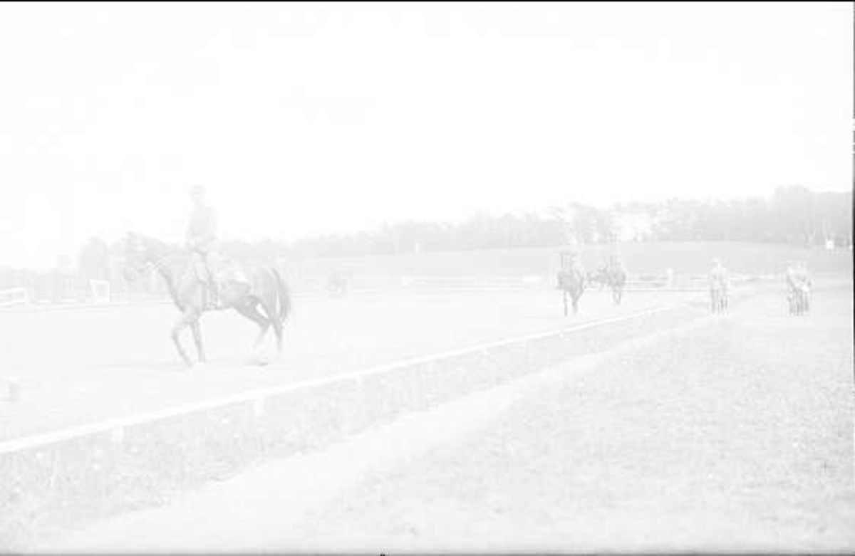 Dressyrridning på dressyrbanan öster ridhuset. I bakgrunden Dunkehallsåsen. Inspektion av kav.insp. general Gyllenstierna.