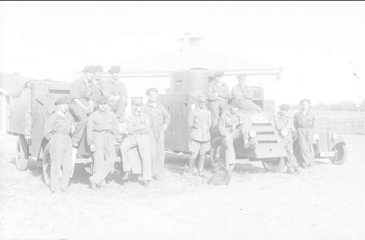 Pansarbilförsöken 1933-35. Jfr. ryttm. W. Odelbergs rapport sept 1935. Skvadronschefen ryttm. Sven von Essen och sergeant Tore Magnusson med del av pansarbilskvadronen utanför garaget. I bakgrunden sjukstallet.