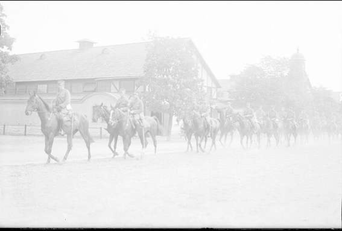 På marsch mot stallet efter avslutad övning till häst. Aspirantskolan var uppstallad i livskvadronsstall, beläget strax framför tätryttaren. Inridningen till kaserngården skedde genom ridhusgrinden eller västra grinden.