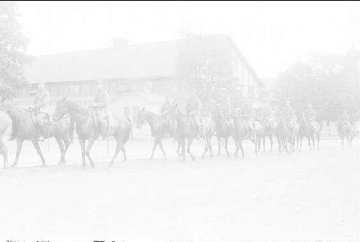 På marsch mot stallet efter avslutad övning till häst. Aspirantskolan var uppstallad i livskvadronsstall, beläget strax framför tätryttaren. Inridningen till kaserngården skedde genom ridhusgrinden eller västra grinden.