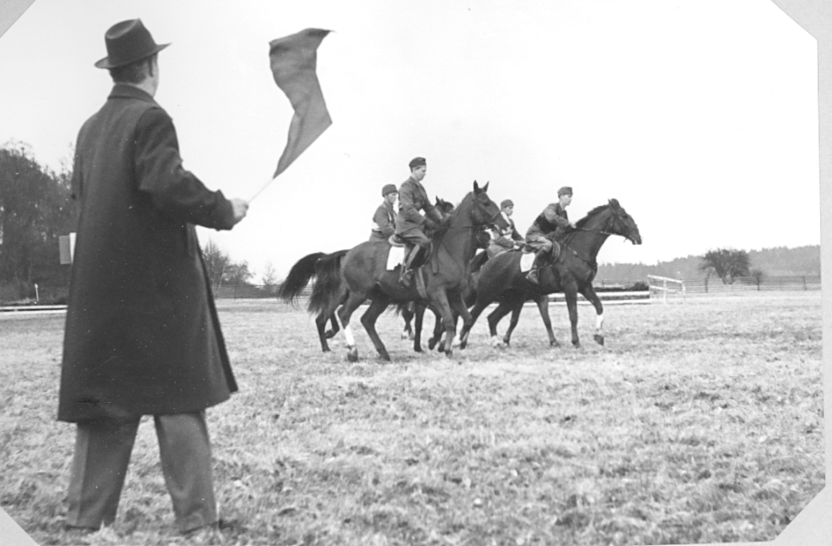 Ridkurs 12/10 1954-13/5 1955 Strömsholm.Från tävlingar maj 1955.Ryttmästare Dyrssen släpper iväg underofficersfältet:de Flon, Zetterberg, Nilsson(I 15), E. Olausson, Johansson(K 1).Deltagare från Livregementets husarer, K3:Fänrik Westergren, överfurir Fridolfsson och sergeant Ewert Olausson.Förteckning över övriga deltagare finns i albumet.Chef för ridskolan:Överstelöjtnant Gustav Nyblaeus.Förteckning över övriga lärare finns i albumet.Albumet är en donation från Ewert Olausson.