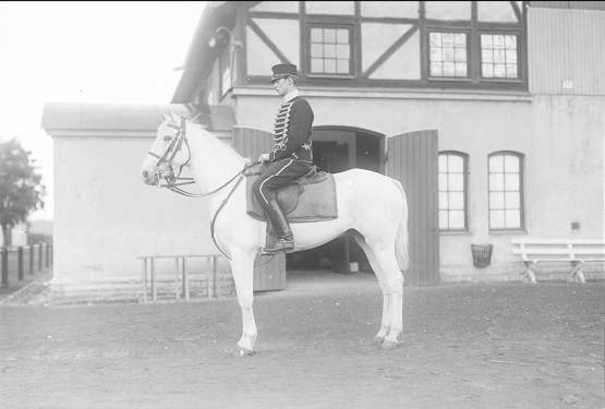 Husar med tilldelad stamhäst söder skvadronens stall. Klädsel; uniform m/1895 (m/ä).