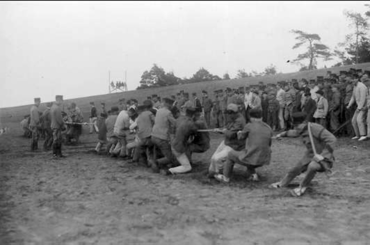 Tävling i dragkamp på "lusharpan", öster K3 kasern (nedanför Dunkehallshöjden).