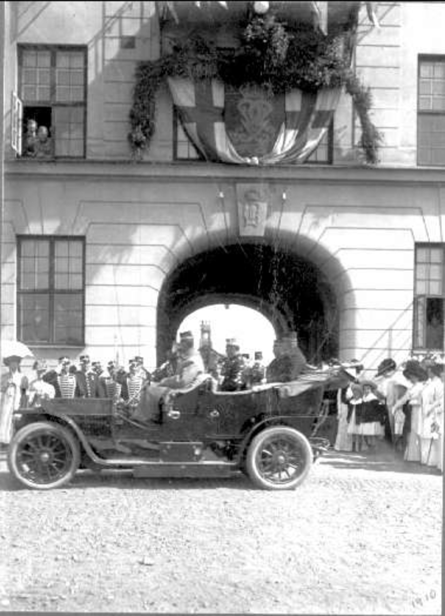 Konung Gustaf V besöker K 3 den 21 Juni 1910. Kortet taget utanför husarkasernen i Skövde.