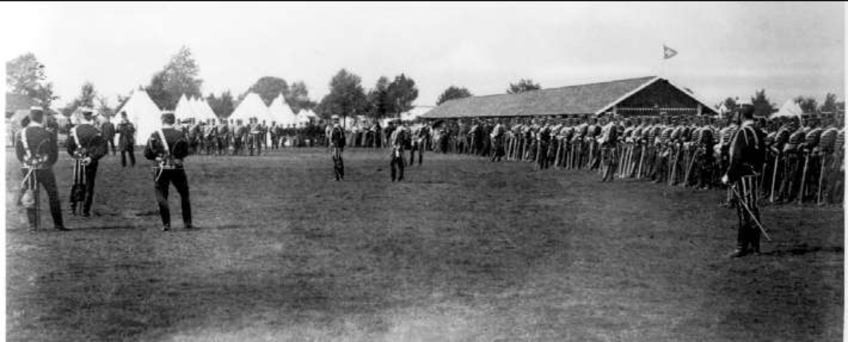 Korum i husarlägret Sanna Hed. I tredje skvadronens lucka (Östra Nerike) i förgrunden prins Eugen.
