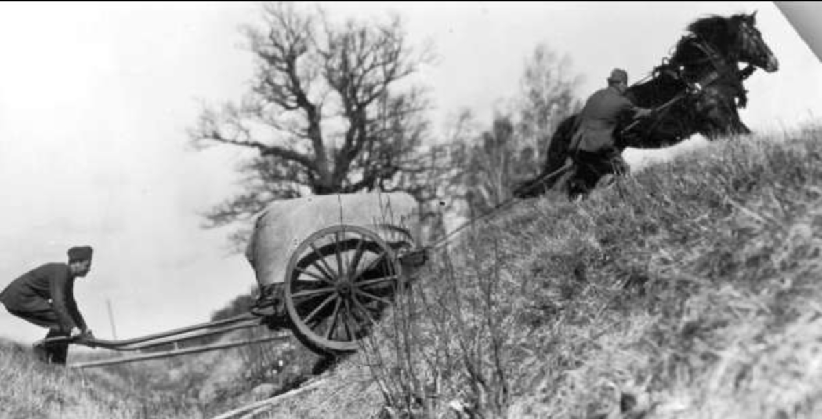 Förspänd tross under övning i svår terräng. Vid hästen, dåvarande furir Tore Jönsson.