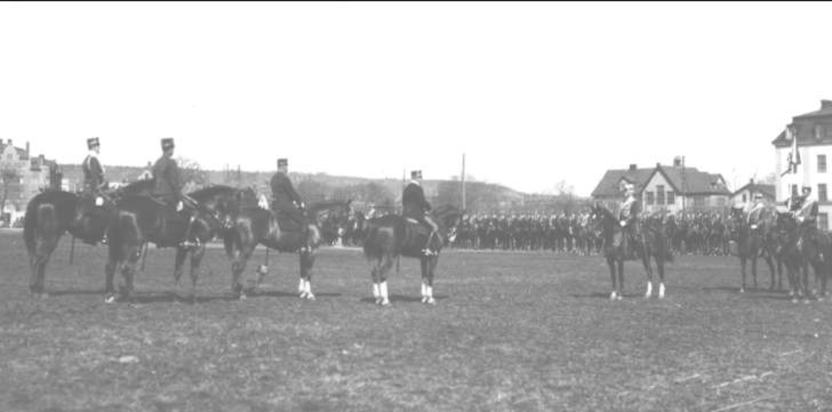 Regementet uppställt för avlämning söder om östra grinden. I bakgrunden marketeriet med underofficersmässen på andra våning.