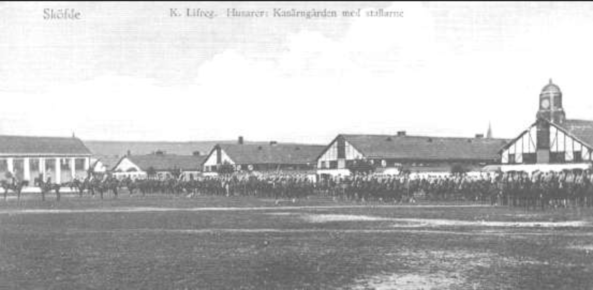 Kunglig Livregementets husarer. Regementet uppställt till häst på kaserngården, söder om stallarna.