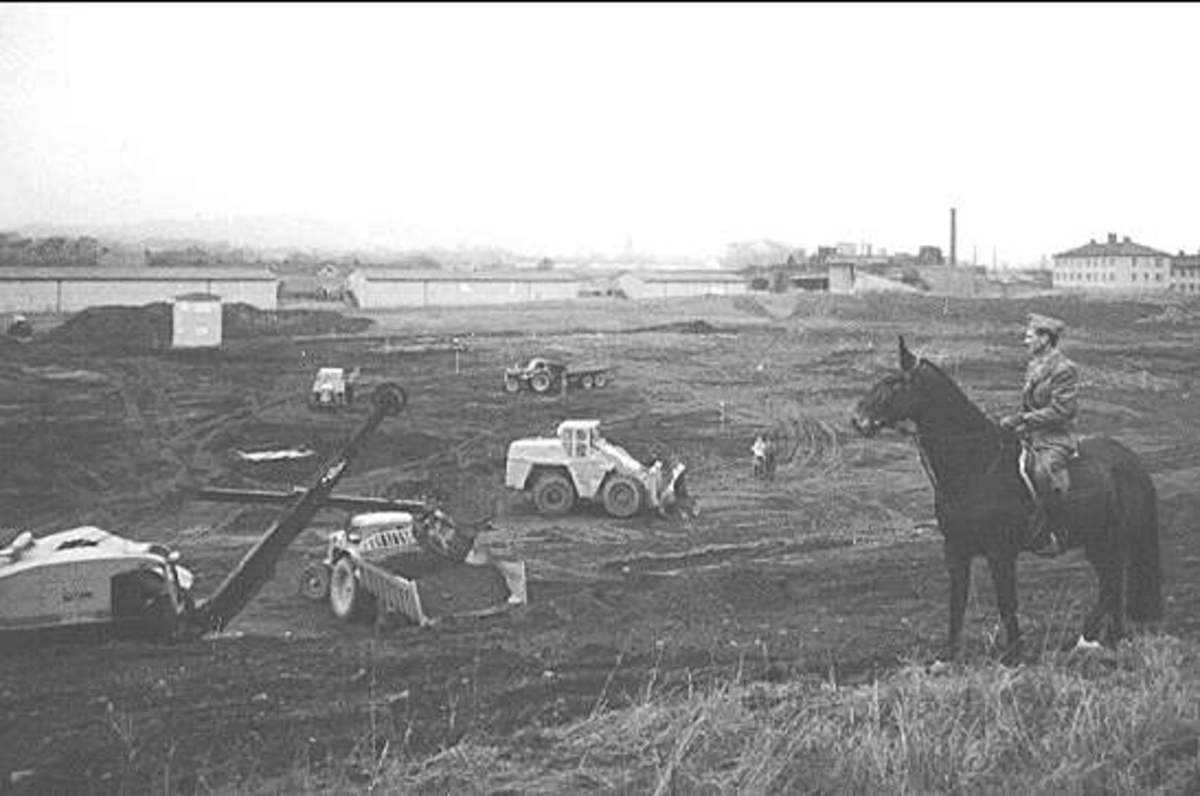 Träningsledaren i ridning, ryttmästare Stig Aaby-Ericsson ser med sorg i hjärtat på hur Volvo raserar prishoppningsbanan för att bygga B18-fabriken.