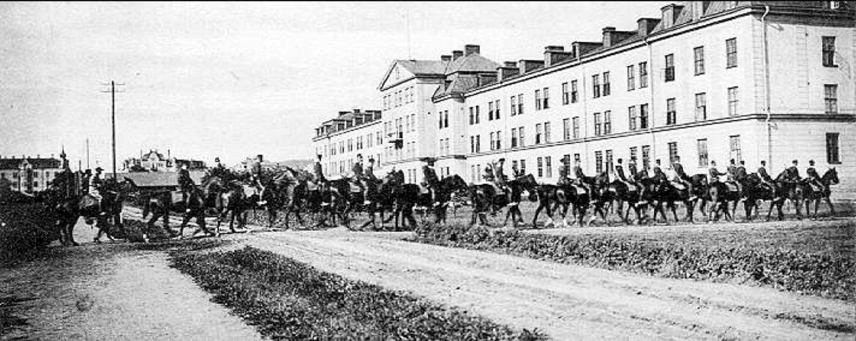 Skövde Livregemetets husarer, kasernbyggnaden från Söder. Hemridande tropp på väg mot "östra grinden".