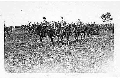 Regementsmötet i Skövde 1912. 5 skvadronen. Reutersvärd, G von Essen, Knickenberg, fanjunkare Lundström.