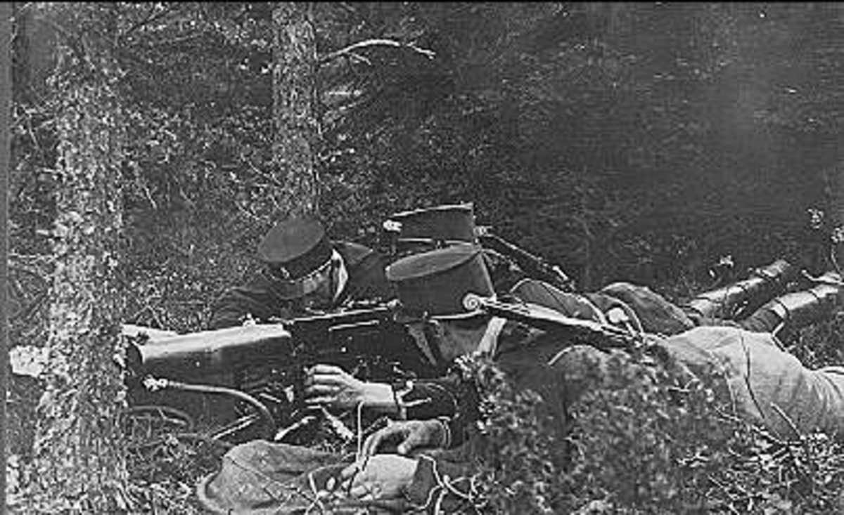 William Dickson och jag på marsch med krigsinkallade. Skyddsställning - laddning