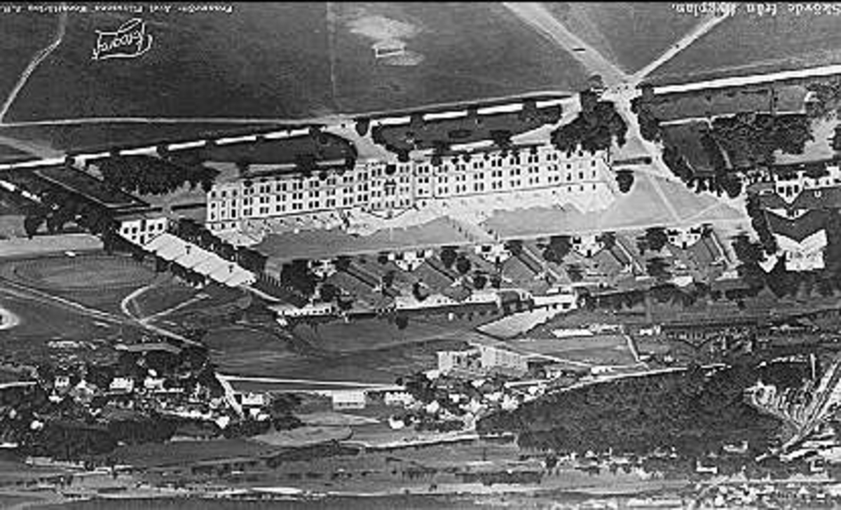 1933 - 1951. Skövde från flygplan. Kungliga Livregementets husarer.