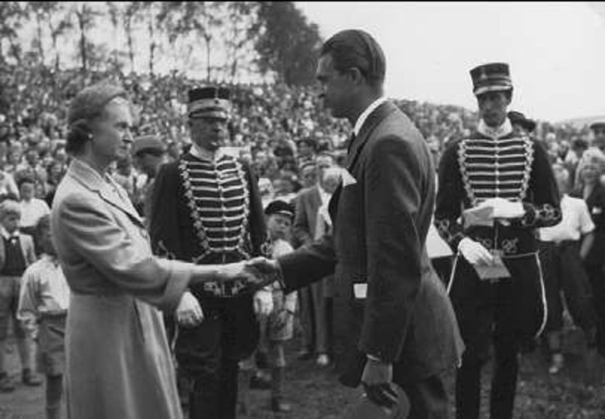 1933 - 1951. Ryttartävlingar i Skövde 1951. Prinsessan Sibylla delar ut pris till Anders Gernanth, senare känd ridsportskommentator i TV. I bakgrunden överste Bergenstråhle och löjtnant Magnus Fornell.