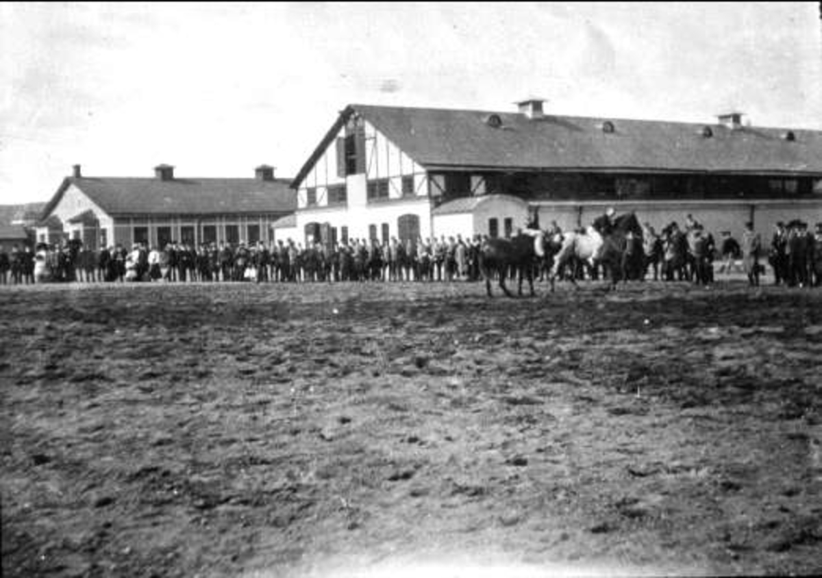 Korpralskolan 1905, skämttävling till häst framför livskvadronens stall.