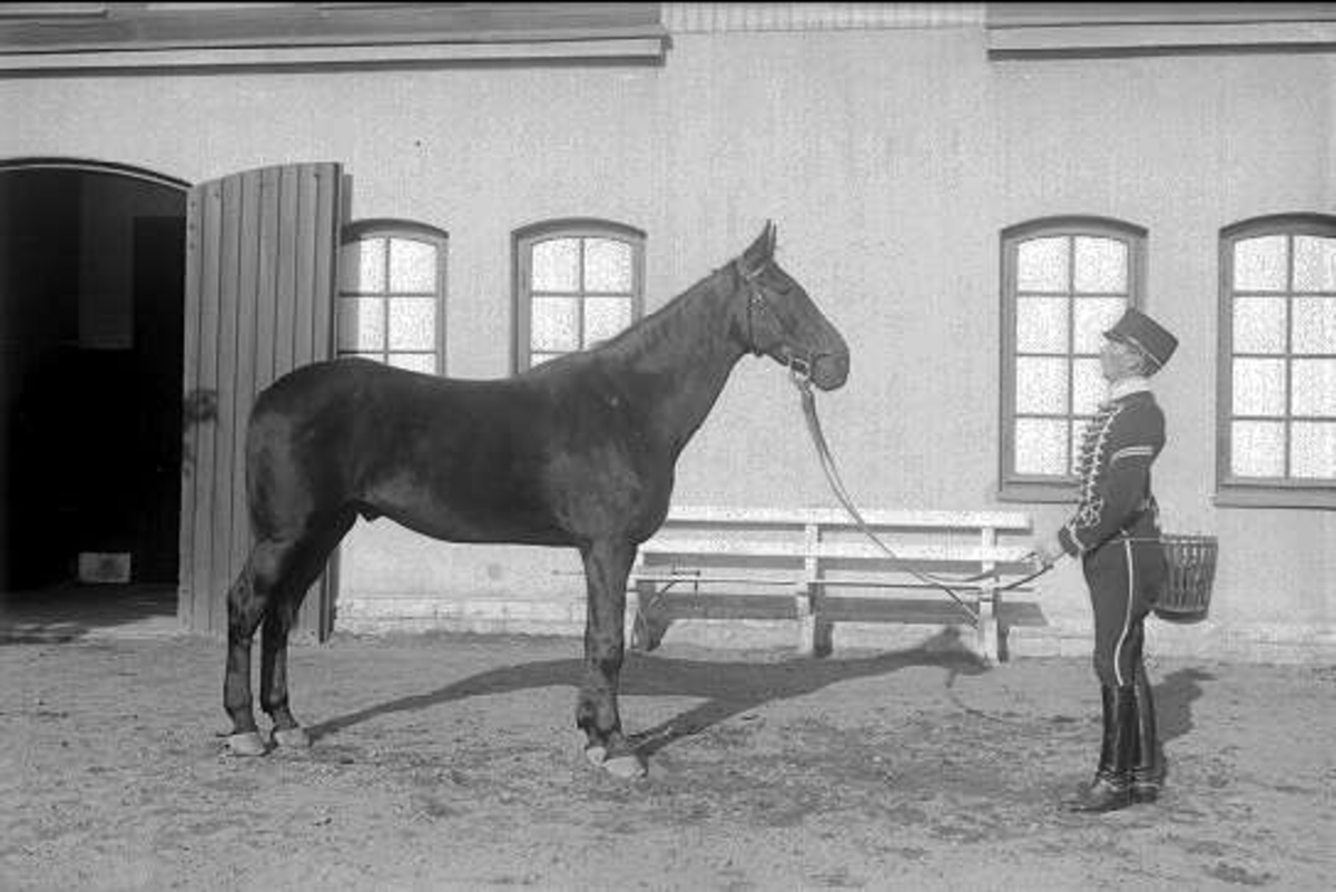 Livhusar med tilldelad stamhäst ur 2.skvadron framför skvadronens stall.