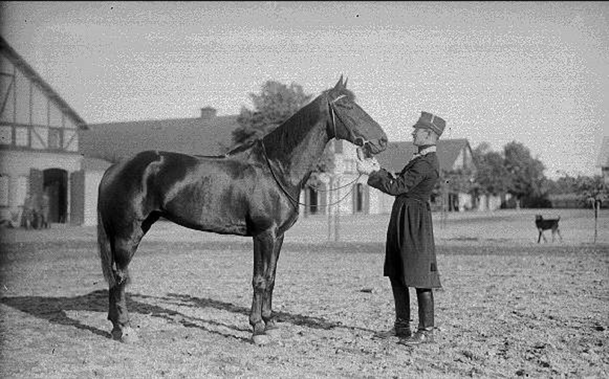 Officer i bigesch med tjänstehäst på kaserngården söder om skvadronstallarna. Dagofficersbricka med blått band runt kragen.