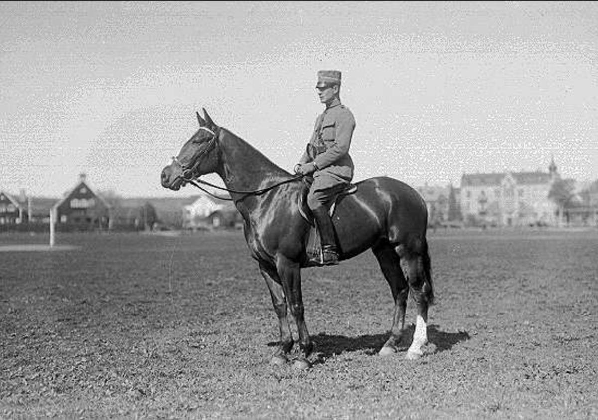 Officer K3 med tjänstehäst på fältet söder kasern. I bakgrunden till vänster soldathemmet.