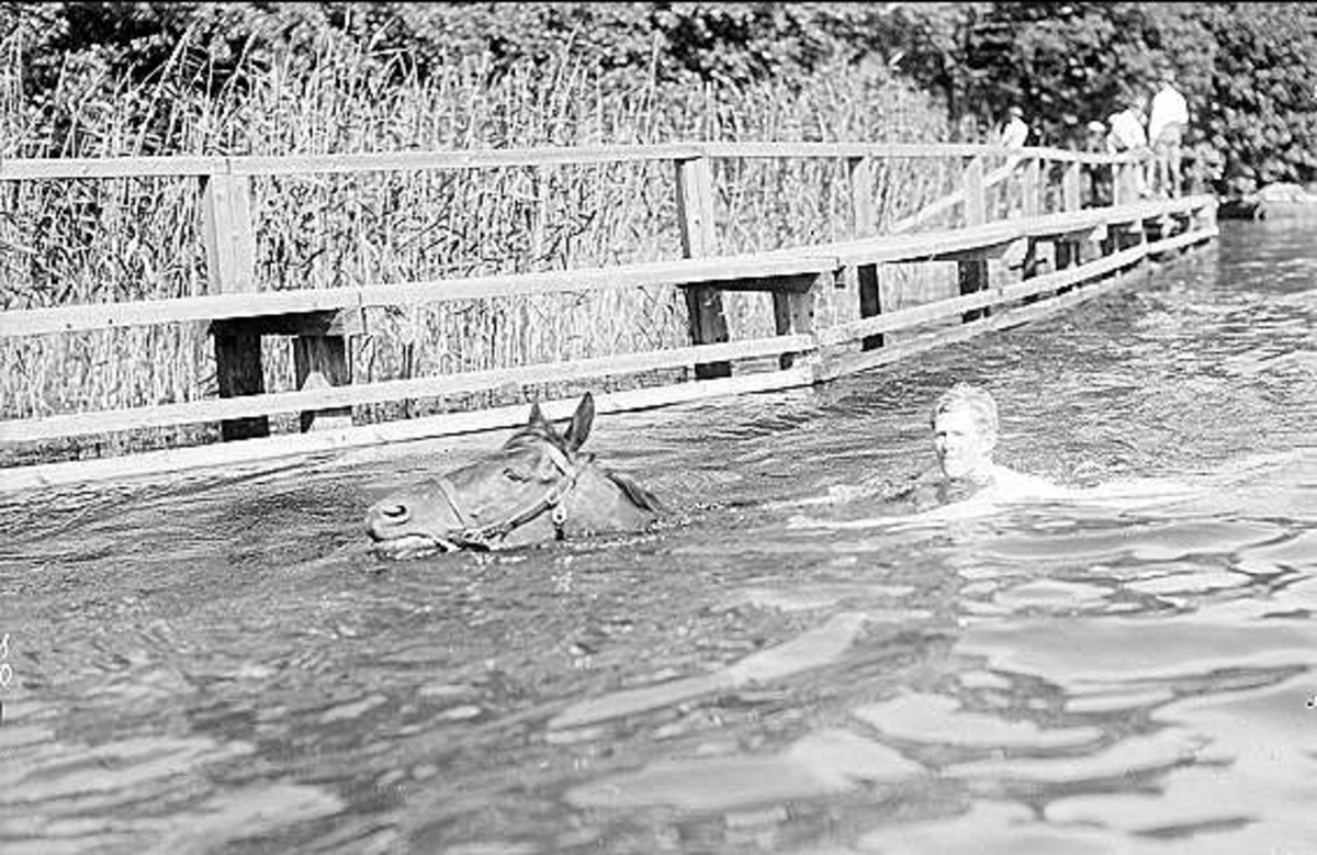 Titel: Vid bryggan i Sjötorpssjön tränades först svämning av hästar - hästen simmade och ryttaren ledde den gående på bryggan - därefter simning med häst längs bryggan. Därefter var det klart för simning med häst ute i sjön.