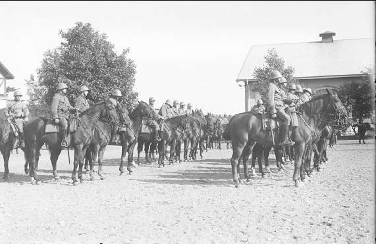 Tropp ur 4. skvadron uppställd på kaserngården söder skvadronens stall. I bakgrunden ridhuset.