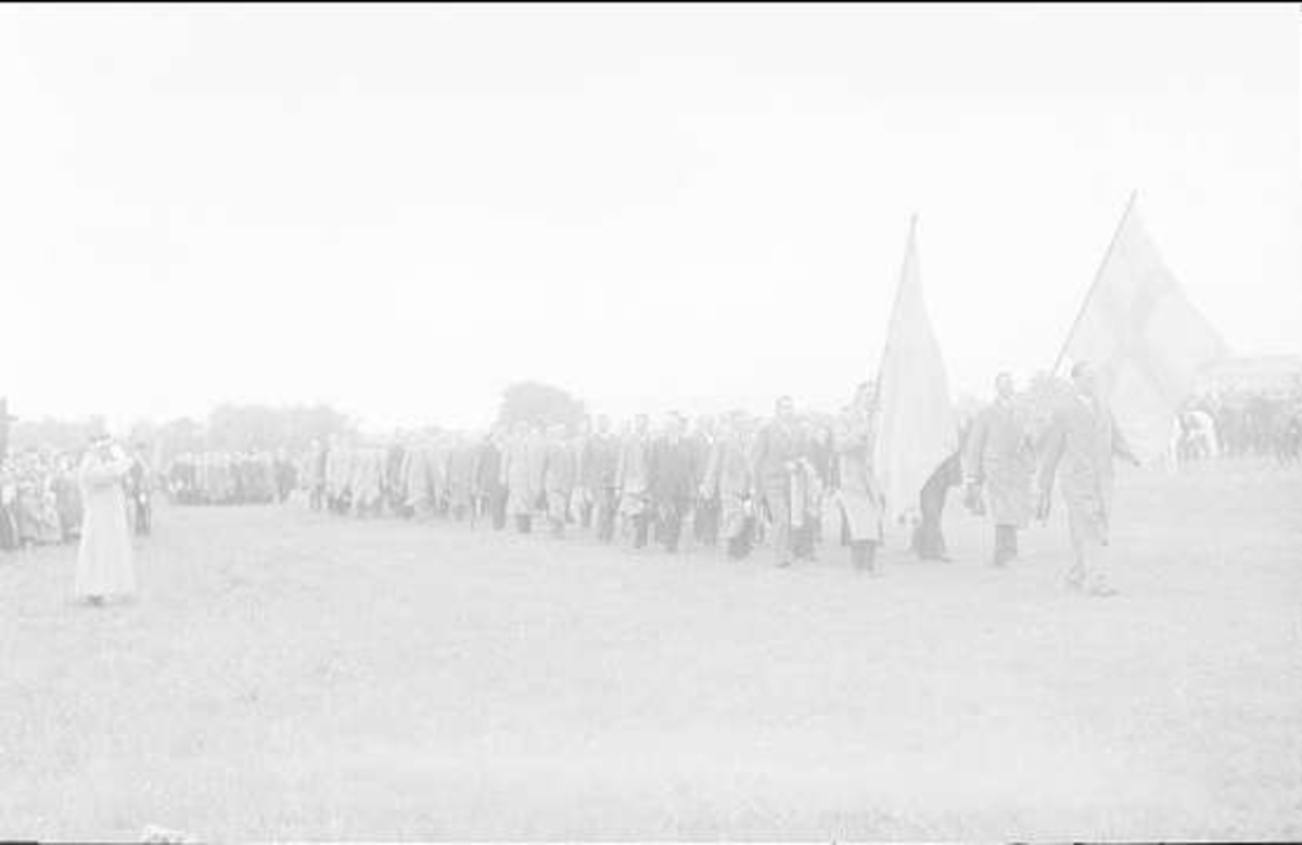 Deltagarna i kamratdagen 7 juni 1937 marscherar ut till uppställningsplatsen på fältet söder om kasern för att lämna av till sekundchefen. I bakgrunden den beridna musikkåren med vit pukhäst.