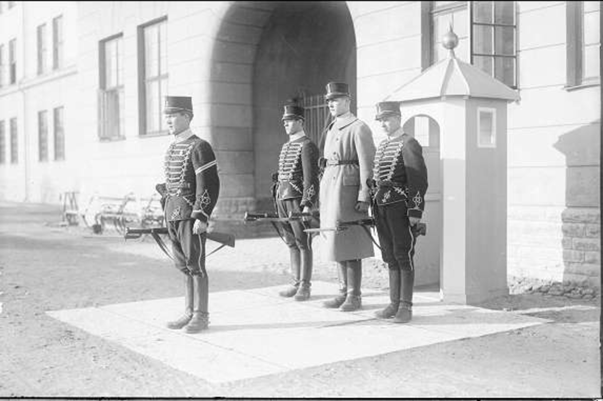 K 3 kasernvakt på poststället. Vakten består av vaktchef (furir), vaktchefs ställföreträdare (kvar i vaktlokalen) och tre poster.