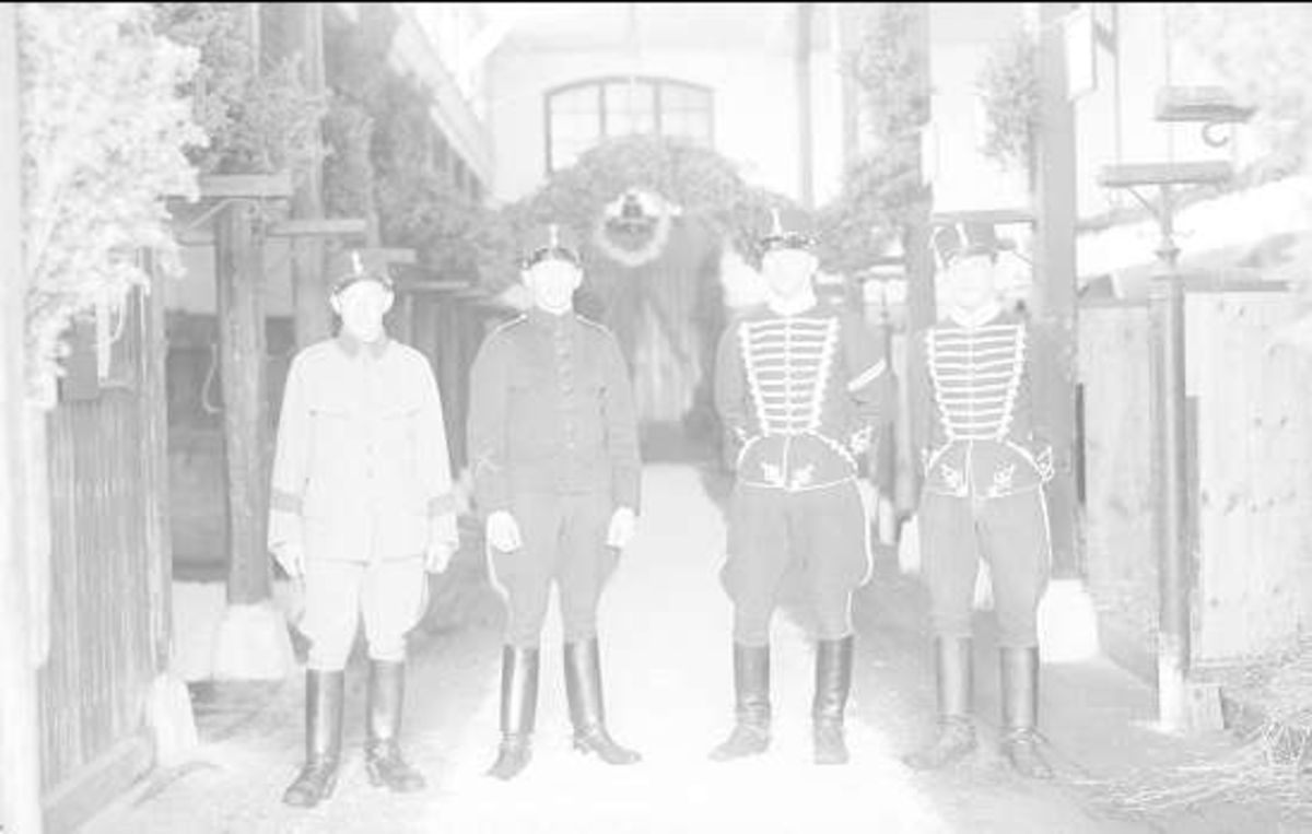 Personerna antagligen stallpersonal; en stallfurir och tre hästskötare, varav en hästskötare från annat förband. Klädsel m/10 och m/ä.