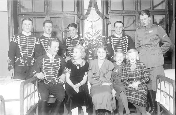 Del av beredskapstroppen under julfirande i kasern. Längst till höger i bild furir (i m/23) med fru och barn? Längst fram till vänster (sittande) skvadronens dagunderbefäl (obs dagbrickan). Längst till vänster (stående) trumpetaren med "svalbo" på axlarna.