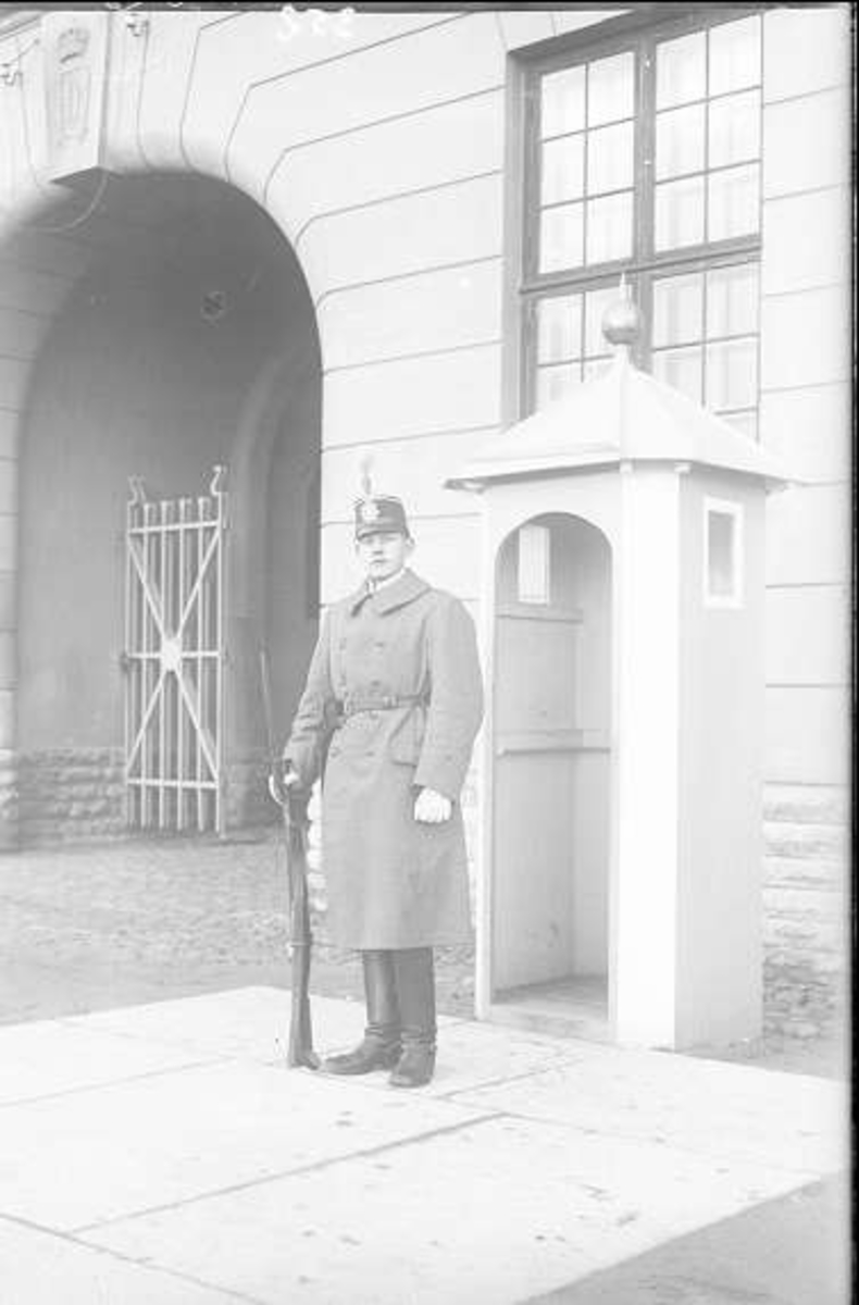 Vaktpost i m/ä och kappa m/10 utanför valvet på K 3 kasern.