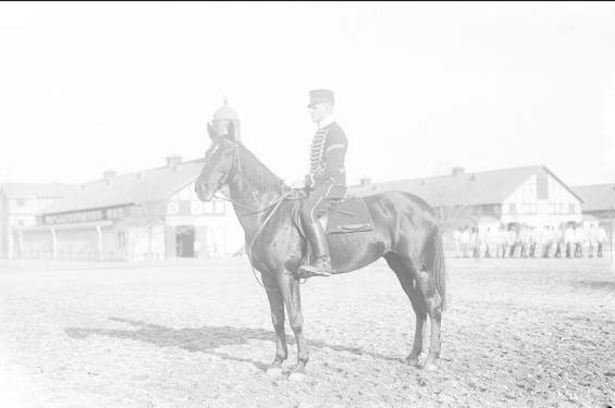 Furir på officers tjänstehäst på kaserngården söder skvadronsstallarna.